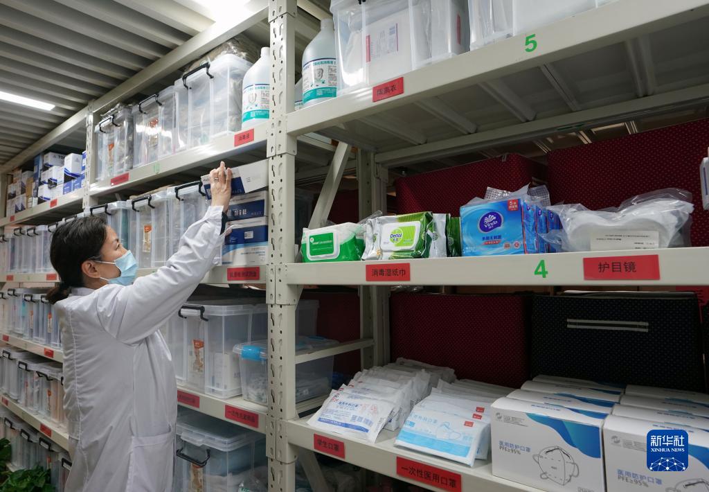 2月13日,上海市長(cháng)寧區天山第一小學(xué)的衛生老師在倉庫內整理防疫用品。