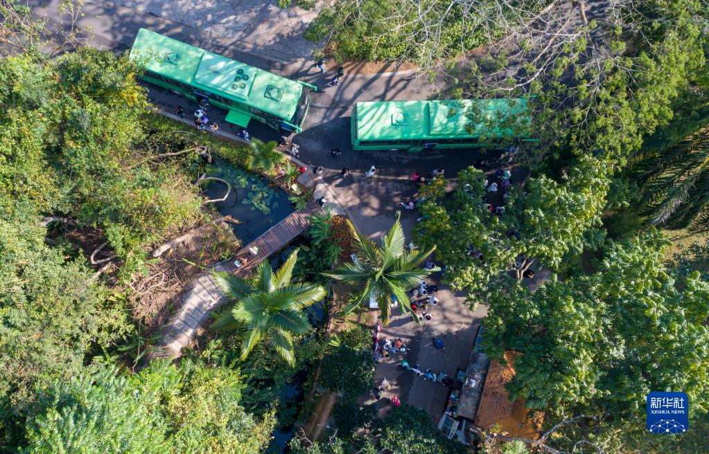 2月12日,游客乘坐旅游大巴抵達位于西雙版納州勐臘縣勐侖鎮的中國科學(xué)院西雙版納熱帶植物園(無(wú)人機照片)。
