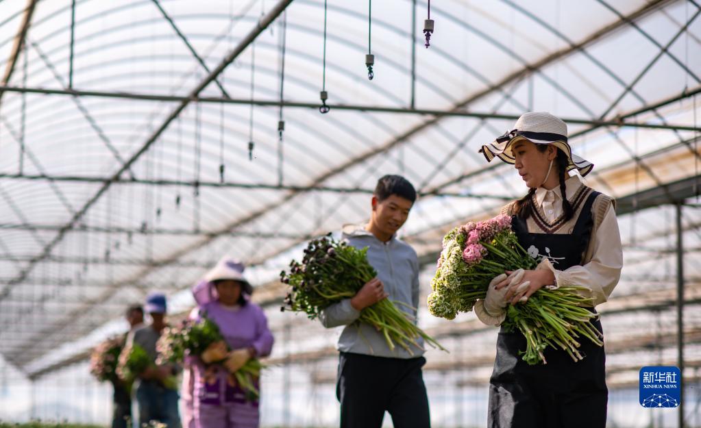 主播畢茜茜(右一)與家人抱著(zhù)剛采摘的鮮花準備進(jìn)行分揀包裝(2月12日攝)。