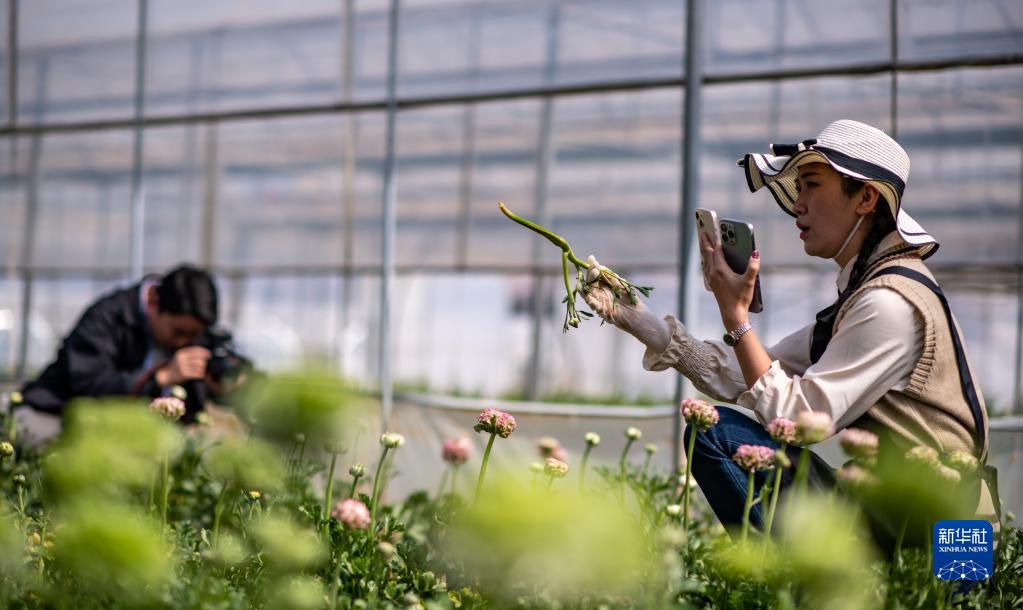 主播畢茜茜在鮮花地里直播(2月12日攝)。