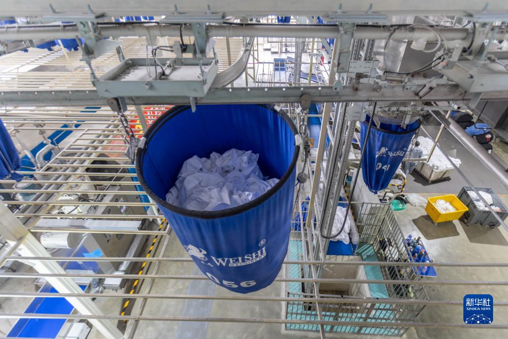 2月14日,在華鐵旅服上鐵勤佳洗滌廠(chǎng),裝滿(mǎn)待清洗臥具的布草吊袋按照自動(dòng)化洗衣系統指示運轉。