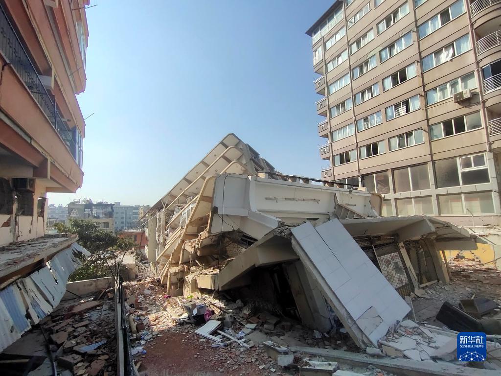 這是2月13日在土耳其哈塔伊省安塔基亞市拍攝的因地震損毀的建筑物。