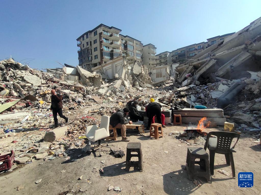 2月13日,在土耳其哈塔伊省安塔基亞市,人們在地震廢墟旁休息。