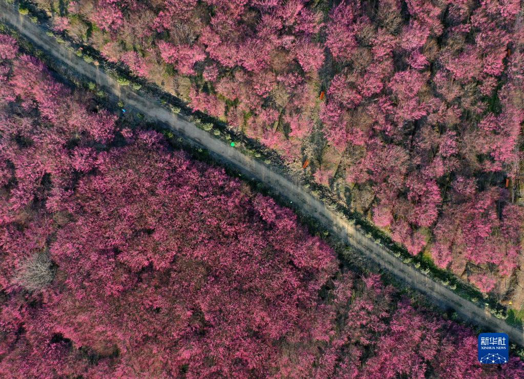 早春時(shí)節,位于安徽省巢湖市廟崗鎮清水灣梅花園的千畝梅花相繼盛開(kāi),朵朵梅花如霞似火,吸引人們徜徉花海,感受春日的美好。