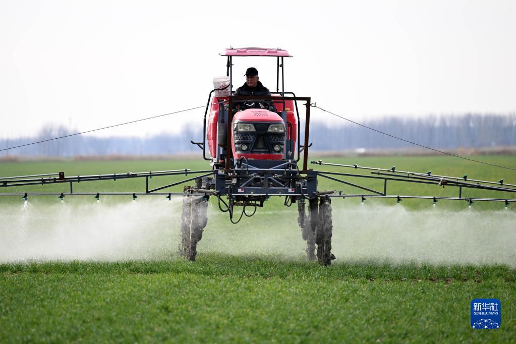 2月14日,在安徽省蚌埠市五河縣頭鋪鎮,農民駕駛農機給小麥噴灑農藥。