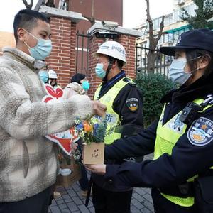 2月15日,黃浦區特殊教育職業(yè)學(xué)校的學(xué)生將咖啡與花贈送給護校警察。