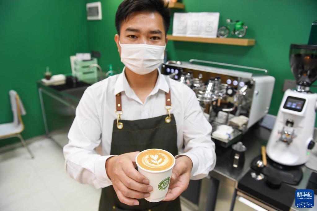 2月15日,在深圳咖啡主題郵局,咖啡師展示剛制作完成的拿鐵。