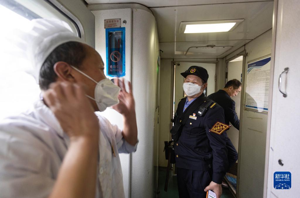 2月13日,車(chē)輛乘務(wù)員李金文與值乘的廚師同事打招呼。
