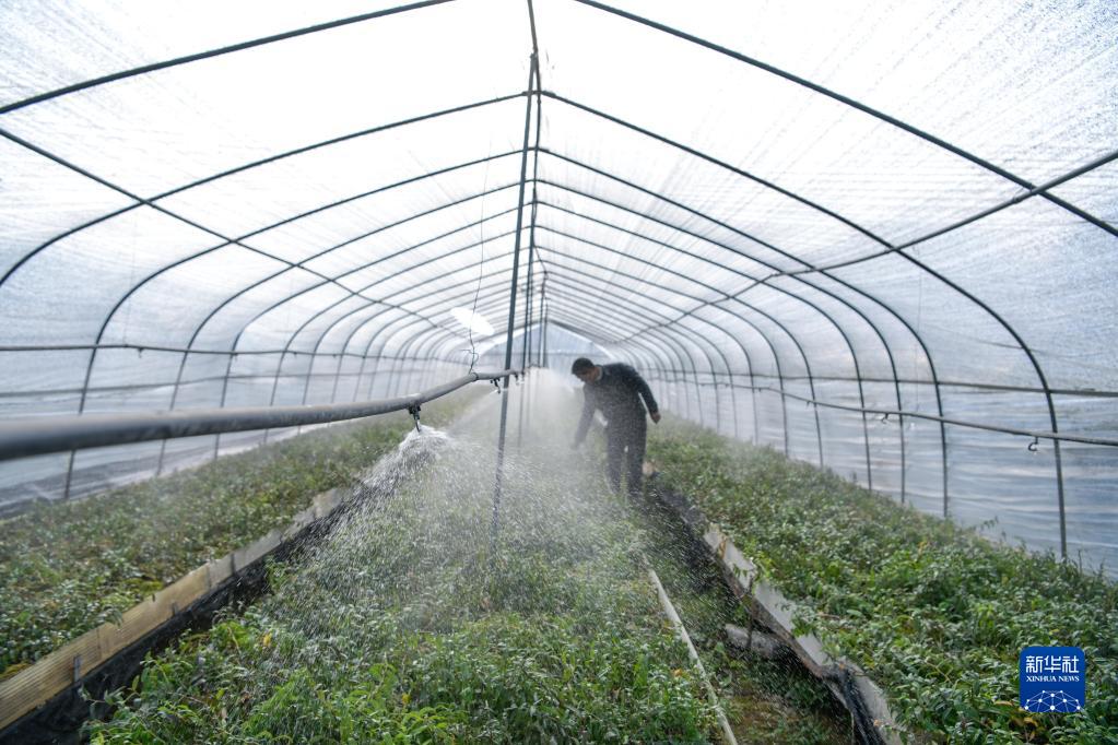 2月14日,在貴州省從江縣貫洞鎮鐵皮石斛育苗基地,工人利用自動(dòng)噴灌系統給鐵皮石斛苗澆水。