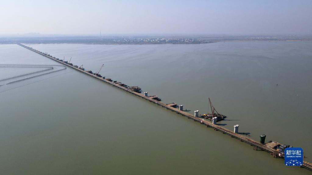 這是2月15日拍攝的合新鐵路安徽段懷洪新河特大橋跨沱湖水中墩施工現場(chǎng)(無(wú)人機照片)。