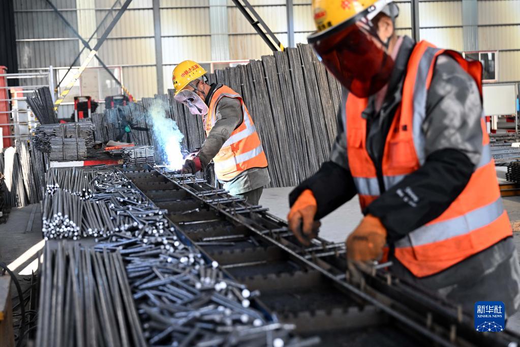 2月15日,中鐵十五局施工人員在合新鐵路安徽段五河北制梁場(chǎng)加工鋼筋。