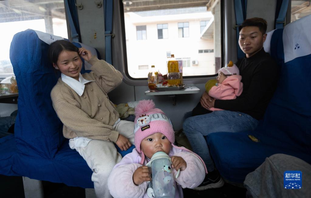 2月13日,在臨客K4618次列車(chē)上,來(lái)自四川省德昌縣的夫婦帶著(zhù)兩個(gè)孩子外出務(wù)工。