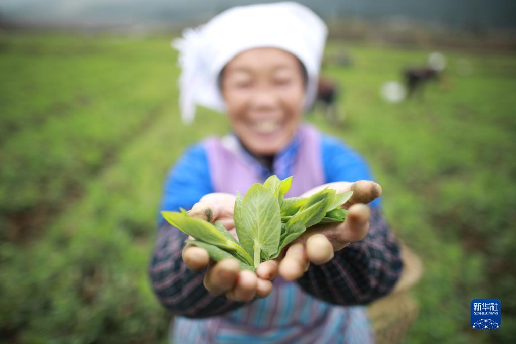 2月15日,在龍里縣灣灘河鎮郊外,菜農在展示剛剛采摘的豌豆尖。