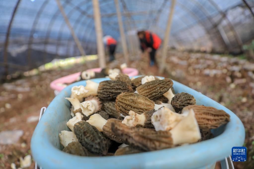 2月15日,在湖南省衡陽(yáng)市衡陽(yáng)縣渣江鎮三馬新村,村民在大棚里采收羊肚菌。