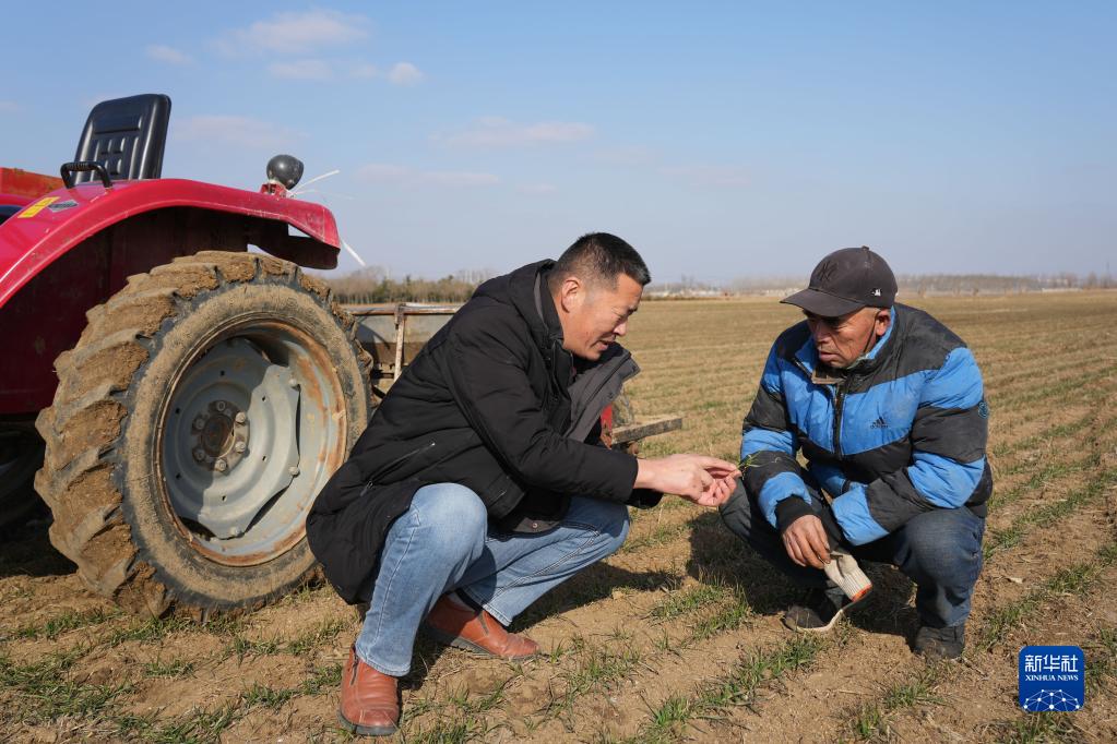 2月15日,山東省威海市文登區金農會(huì )農業(yè)專(zhuān)業(yè)合作社負責人于進(jìn)海(左)和農機手查看返青麥苗。