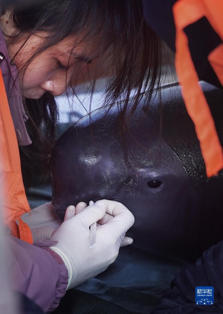 在江西鄱陽(yáng)湖松門(mén)山水域,科研人員在船上為江豚進(jìn)行體檢(2月15日攝)。