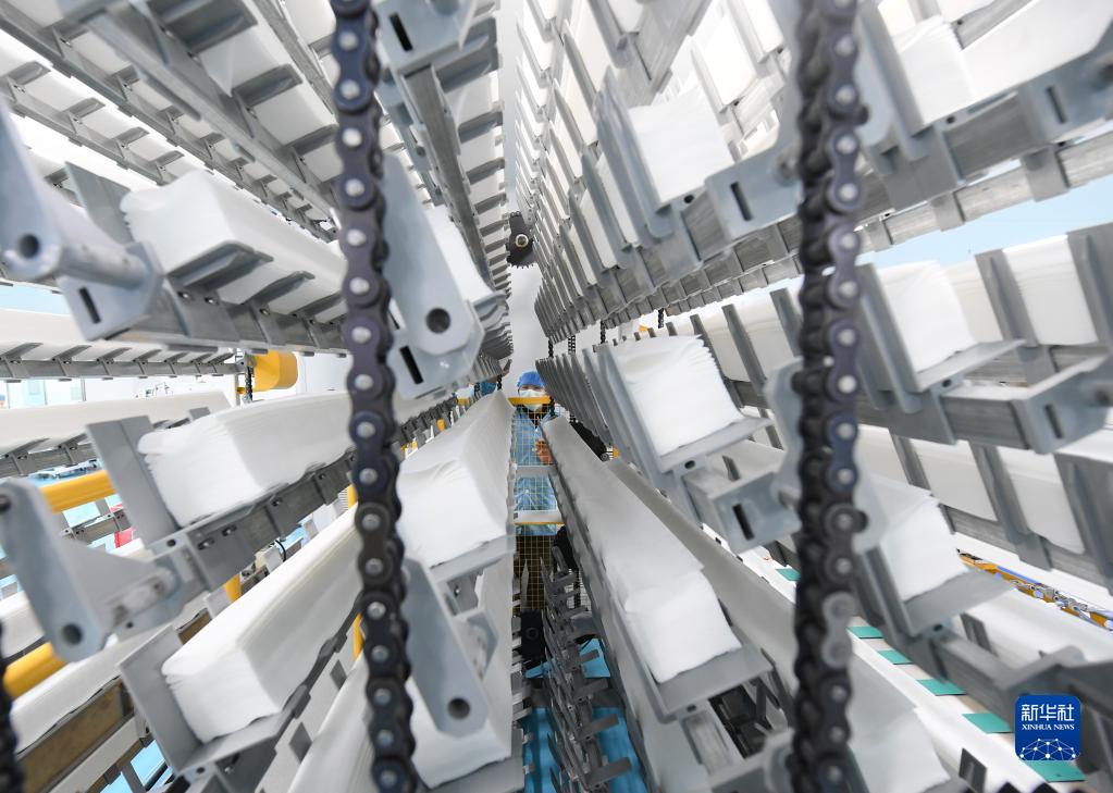 2月16日,在美妝小鎮一家新投產(chǎn)的化妝品企業(yè),工人在查看全自動(dòng)棉柔巾生產(chǎn)情況。