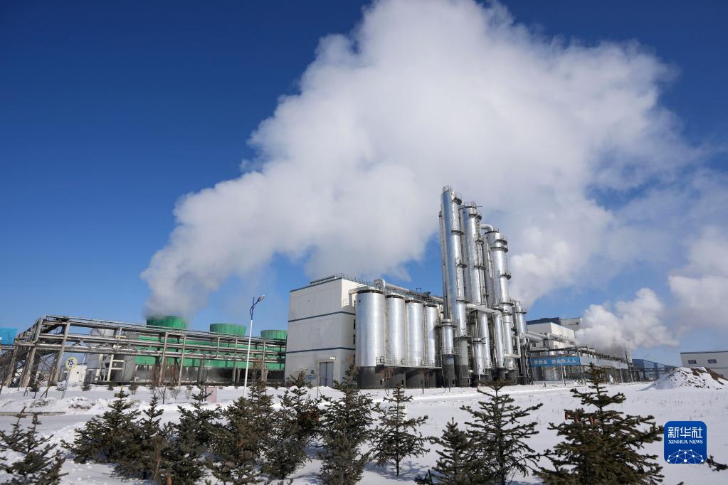 黑龍江鴻展生物能源有限公司的蒸餾塔在運行中(2月15日攝)。