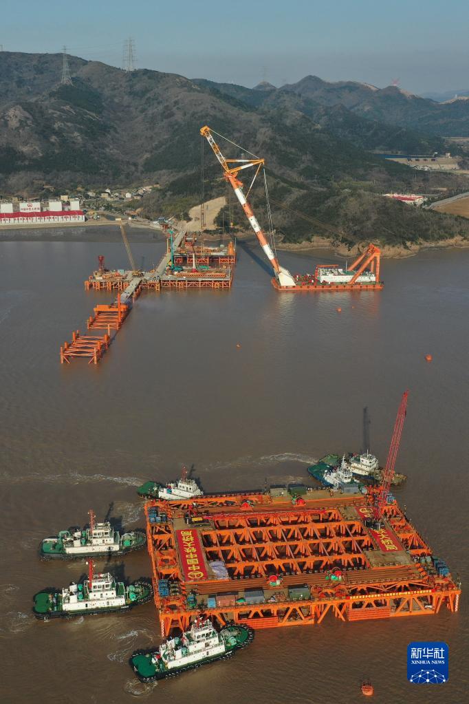 2月16日,拖船將甬舟鐵路西堠門(mén)公鐵大橋5號墩自浮式鉆孔平臺浮運到浙江舟山西堠門(mén)水道,遠處是用于修建大橋的施工棧橋(無(wú)人機照片)。