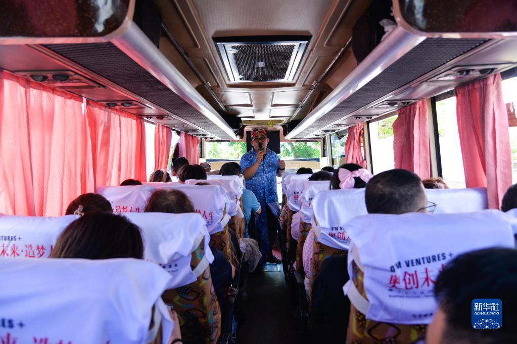 2月12日,在印度尼西亞巴厘島,當地導游(中)在從機場(chǎng)前往酒店的大巴車(chē)上向中國游客介紹巴厘島。