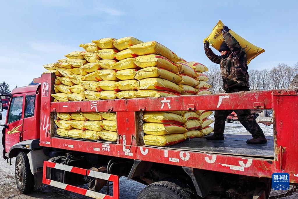2月16日,北大荒集團五大連池農場(chǎng)科技服務(wù)中心工人在裝運肥料。