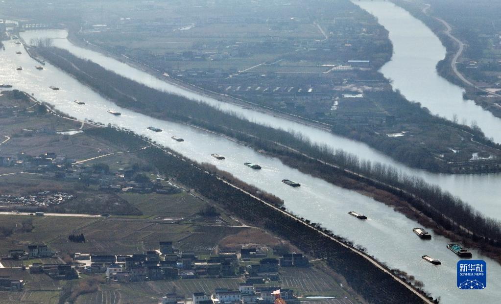 2月15日,貨船行駛在京杭大運河江蘇揚州段(無(wú)人機照片)。