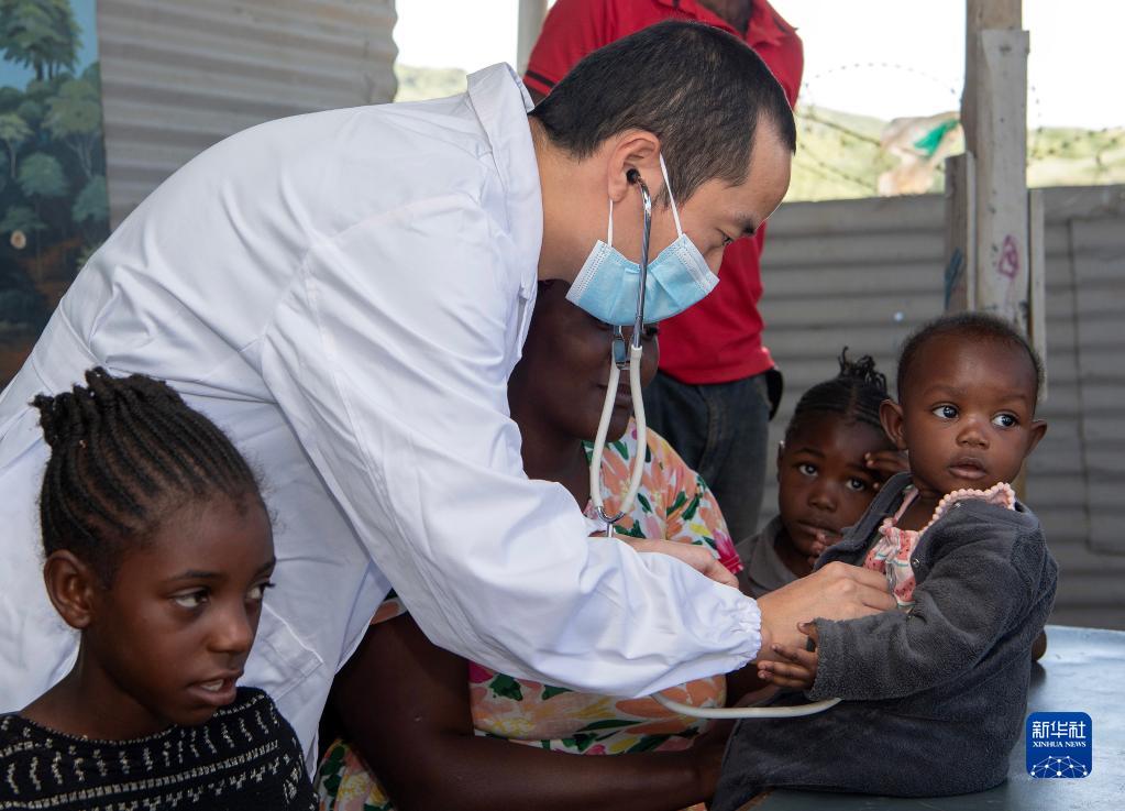 2月16日,在納米比亞首都溫得和克哈瓦那非正式定居點(diǎn)的弗蘭斯藝術(shù)培訓中心,中國醫生為一名兒童體檢。