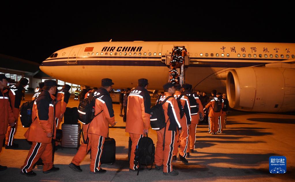 2月16日,中國救援隊隊員在土耳其阿達納國際機場(chǎng)乘坐國航包機回國。