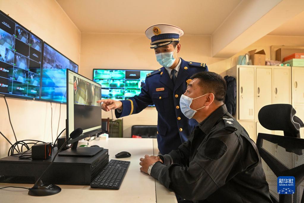 2月16日,天津市東麗區消防救援支隊工作人員在張貴莊街道華亭里社區躍麗家園小區消防安全控制室與工作人員核查智能梯控系統運行情況。