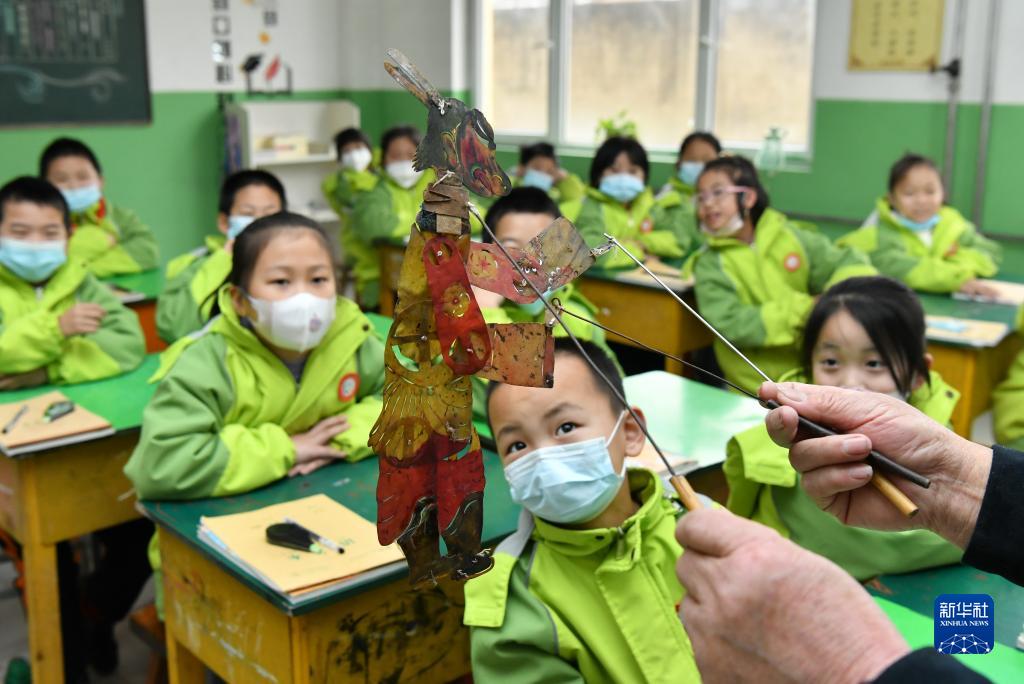 2月17日,張維宗在河北省獻縣段村鎮中心小學(xué)講解皮影戲表演技巧。