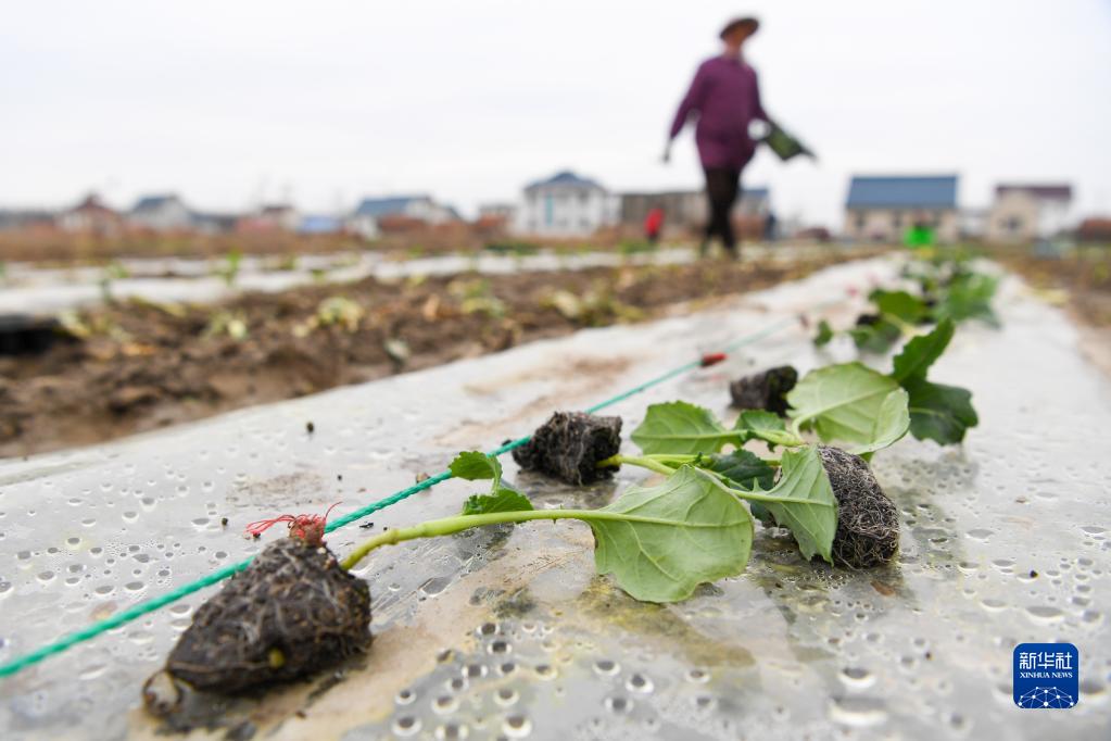 2月17日,農民在江蘇省南通市如東縣大豫鎮一處農田移栽西蘭花幼苗。