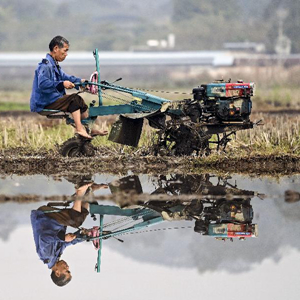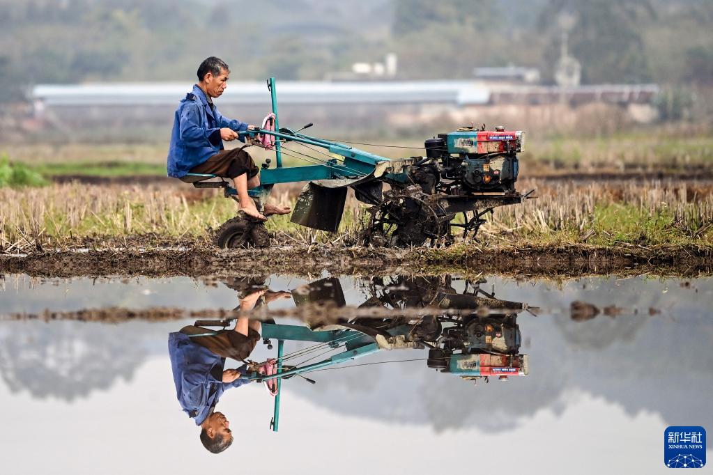 2月17日,廣西欽州市欽北區大寺鎮四聯(lián)村委那老村村民在翻耕稻田。