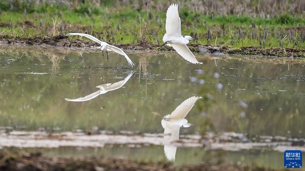 2月17日,白鷺在廣西欽州市欽北區大寺鎮四聯(lián)村委那老村已開(kāi)墾的水田間覓食。