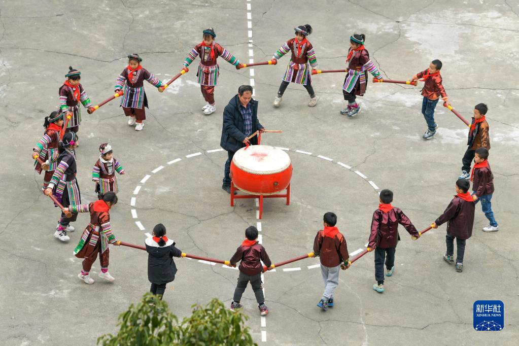 2月16日,貴州省從江縣西山鎮中寨教學(xué)點(diǎn)教師孟榮達(中)與學(xué)生練習瑤族長(cháng)鼓舞。