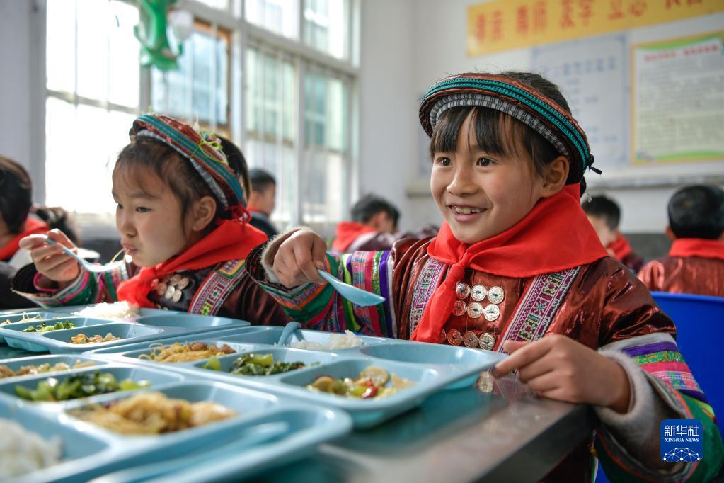 2月16日,貴州省從江縣西山鎮中寨教學(xué)點(diǎn)學(xué)生在享用免費營(yíng)養午餐。