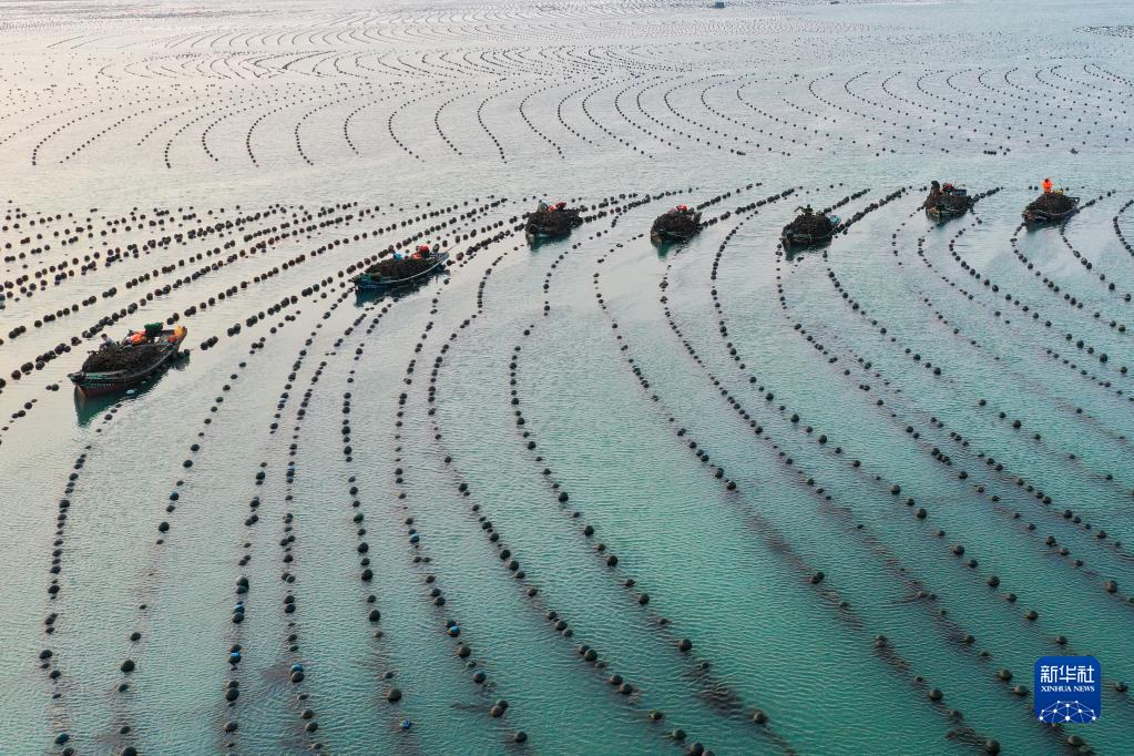 2月17日,在山東威海榮成市俚島灣養殖海區內,漁工在收獲牡蠣(無(wú)人機照片)。