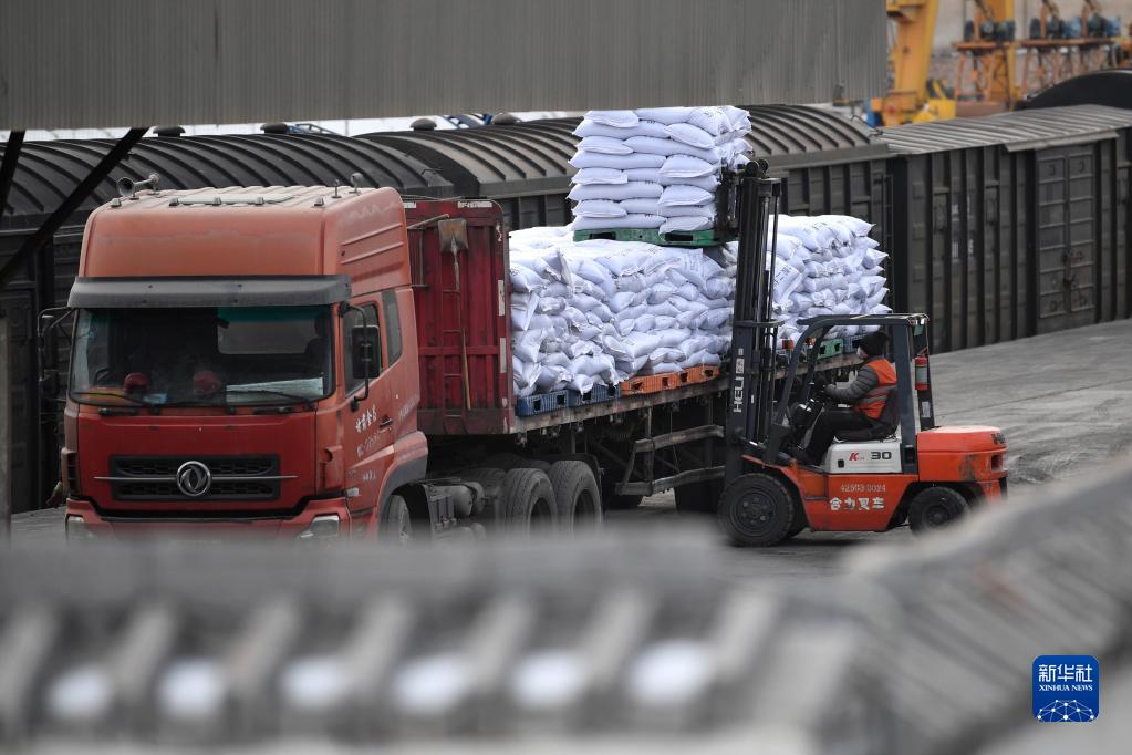 2月17日,工作人員在蘭州貨運中心金昌鐵路貨場(chǎng)內進(jìn)行化肥裝車(chē)作業(yè)。