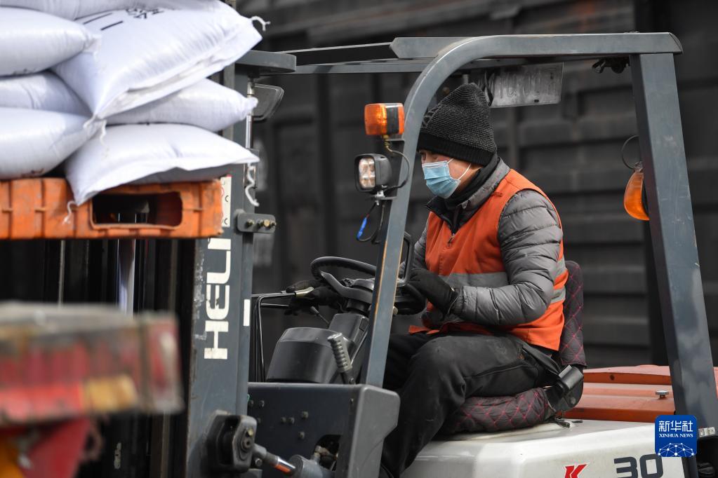 2月17日,工作人員在蘭州貨運中心金昌鐵路貨場(chǎng)內進(jìn)行化肥裝車(chē)作業(yè)。