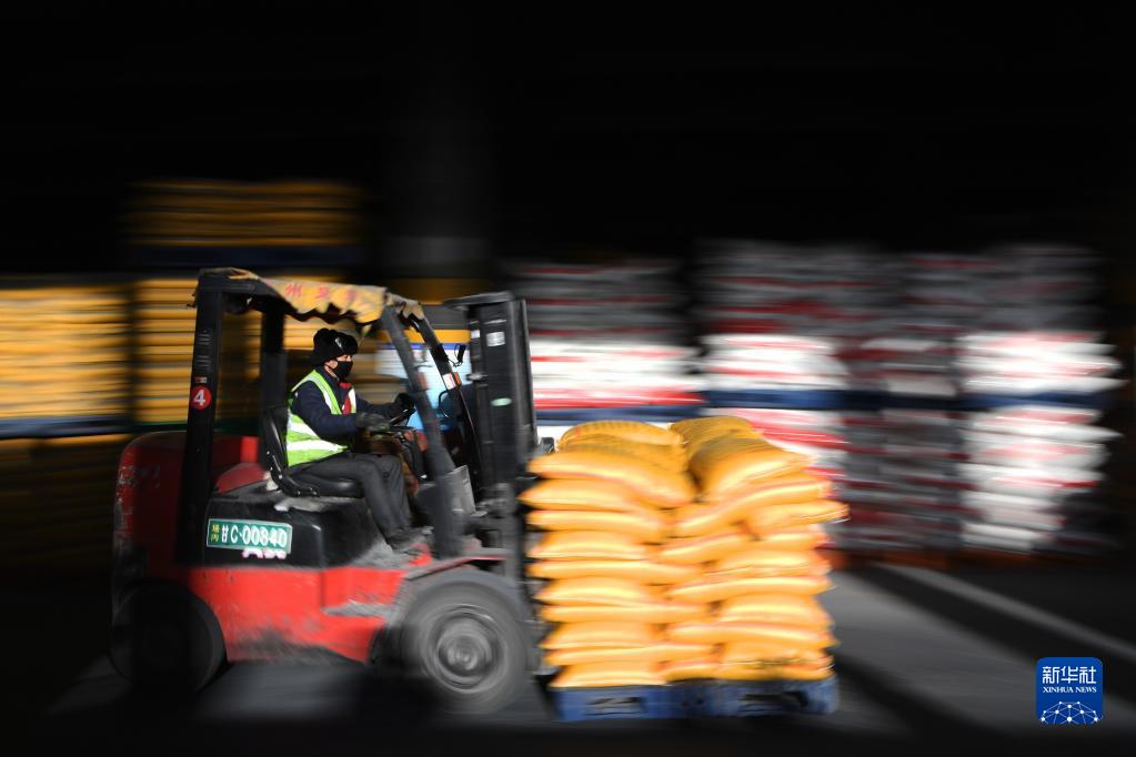 2月17日,在甘肅省金昌市一企業(yè)鐵路專(zhuān)用線(xiàn)上,工作人員駕駛叉車(chē)準備將化肥裝車(chē)。