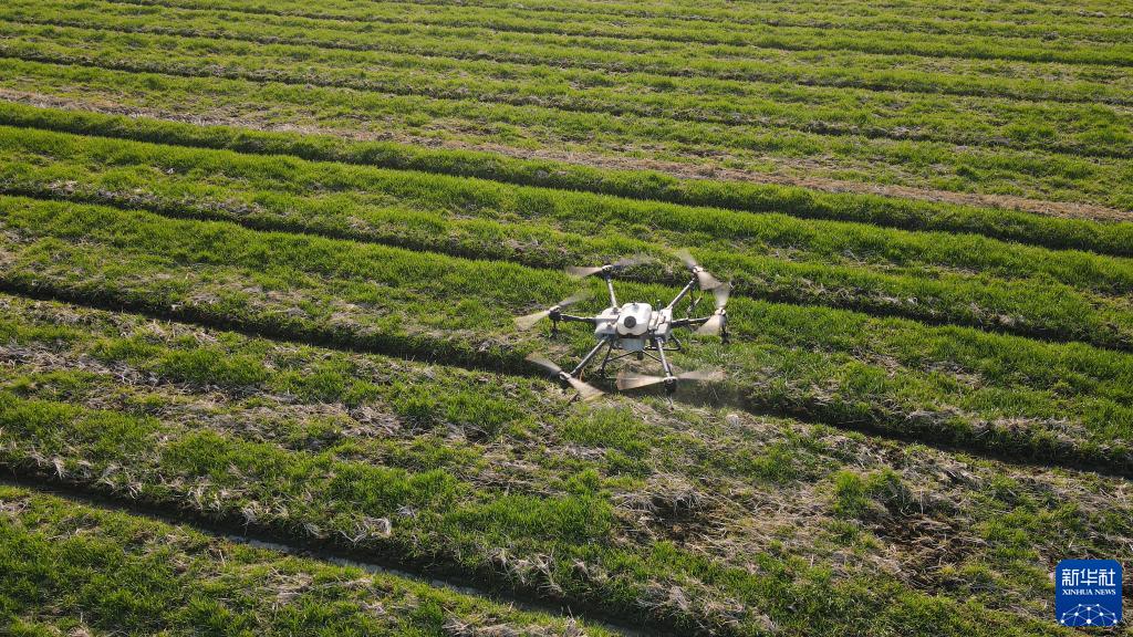 2月15日,在安徽省蕪湖市鳩江區沈巷鎮四連村,農業(yè)無(wú)人機在為小麥噴灑化肥(無(wú)人機照片)。