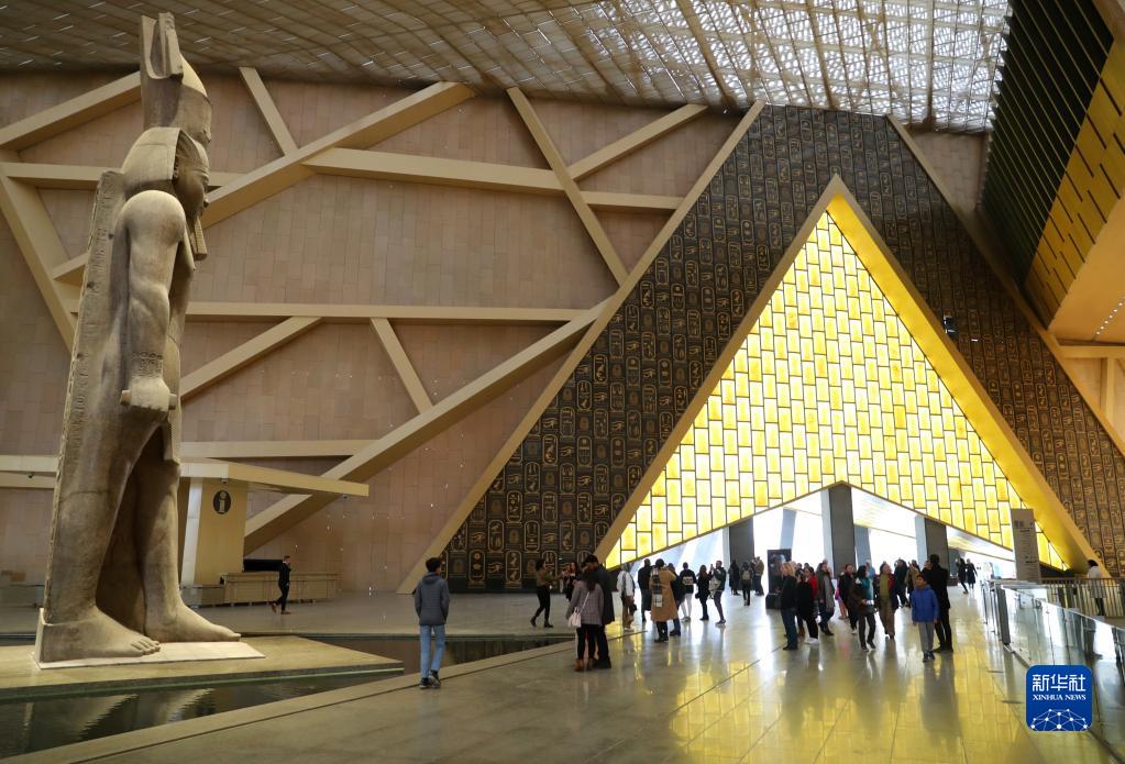 2月11日,游客在位于埃及吉薩省的大埃及博物館入口處參觀(guān)。