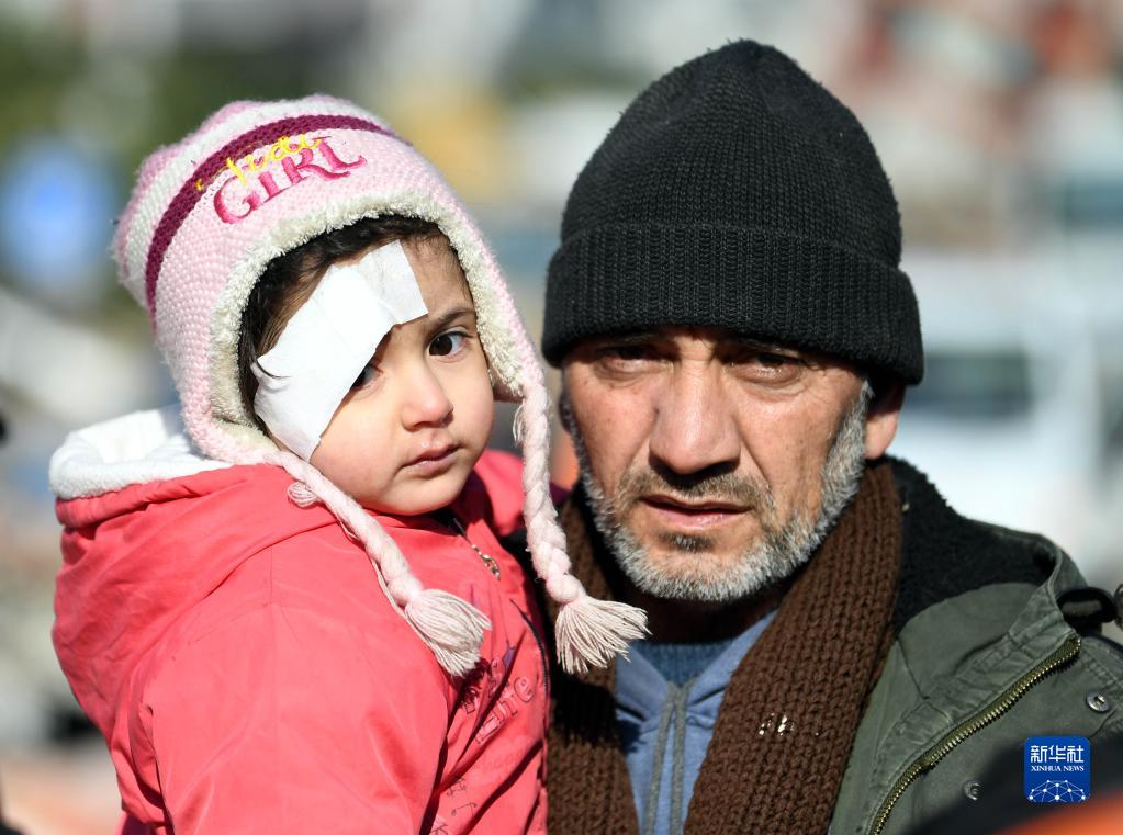 2月11日,一名抱著(zhù)孩子的男子走在土耳其哈塔伊省安塔基亞市街頭。