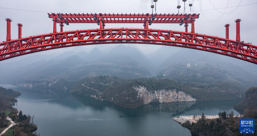 正在進(jìn)行橋面系施工的德余高速烏江特大橋(2月17日攝,無(wú)人機照片)。