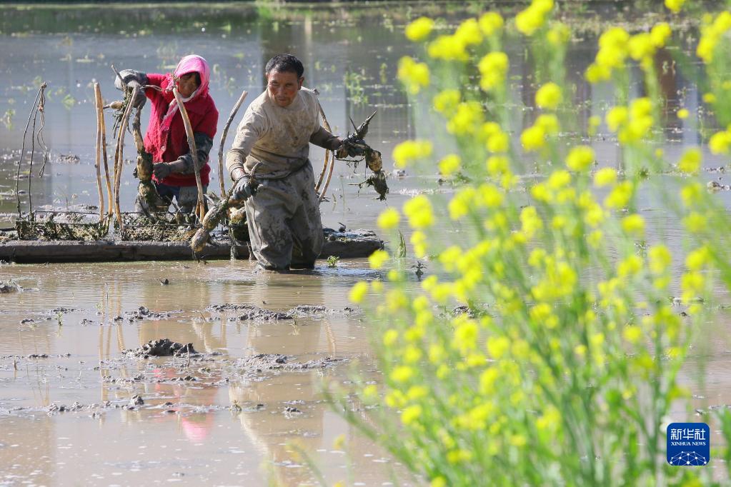 2月18日,在云南省曲靖市麒麟區珠街街道桂花社區,農民在田里種植蓮藕。