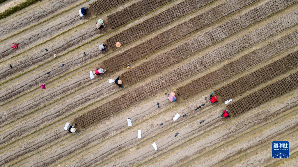 2月18日,在浙江省金華市蘇孟鄉,苗農在田間勞作(無(wú)人機照片)。