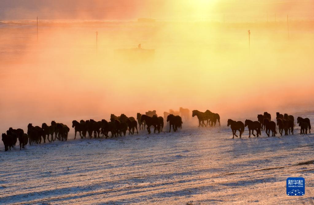 2月18日,馬群在霍林郭勒市額侖草原雪地里奔跑。