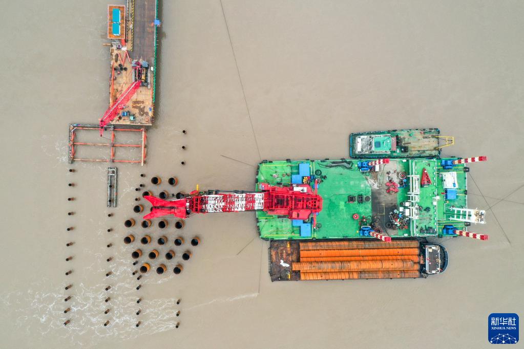 這是2月18日拍攝的崇啟公鐵長(cháng)江大橋永久鋼護筒施打作業(yè)現場(chǎng)(無(wú)人機照片)。
