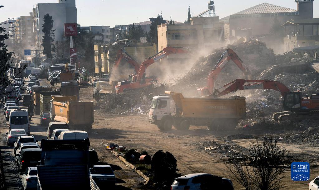 2月18日,在土耳其南部阿德亞曼省阿德亞曼市,挖掘機清理建筑物廢墟。