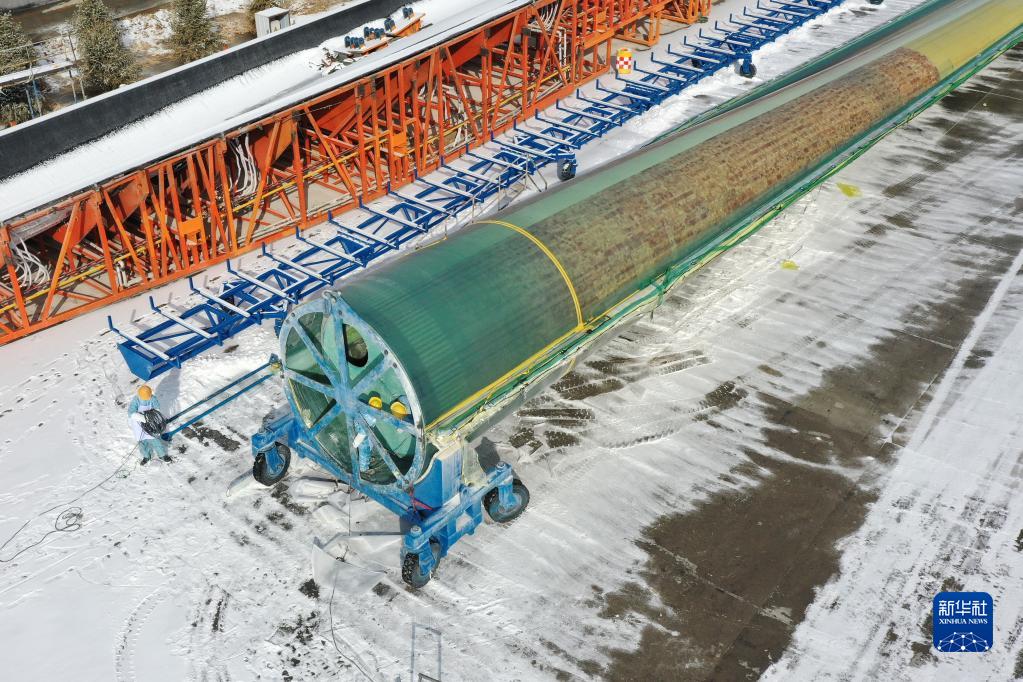 2月18日,在武威市涼州區一家風(fēng)電裝備生產(chǎn)企業(yè),工人檢查風(fēng)機葉片(無(wú)人機照片)。