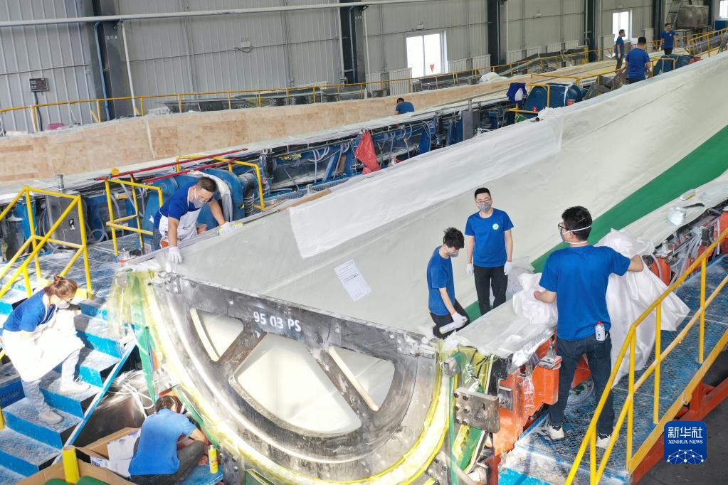 2月18日,在武威市涼州區一家風(fēng)電裝備生產(chǎn)企業(yè),工人在風(fēng)機葉片生產(chǎn)線(xiàn)上工作(無(wú)人機照片)。